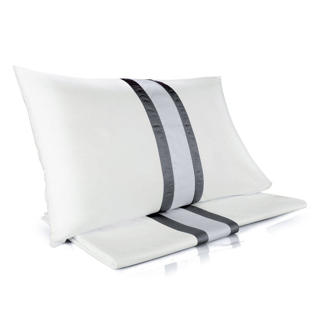 Completo letto in puro cotone con Balza in Raso. Il set è composto da Lenzuolo Sopra, Sotto con Angoli e 2 Federe dalla tinta elegante che valorizza la brillantezza del finissimo puro cotone con dippia balza in raso.