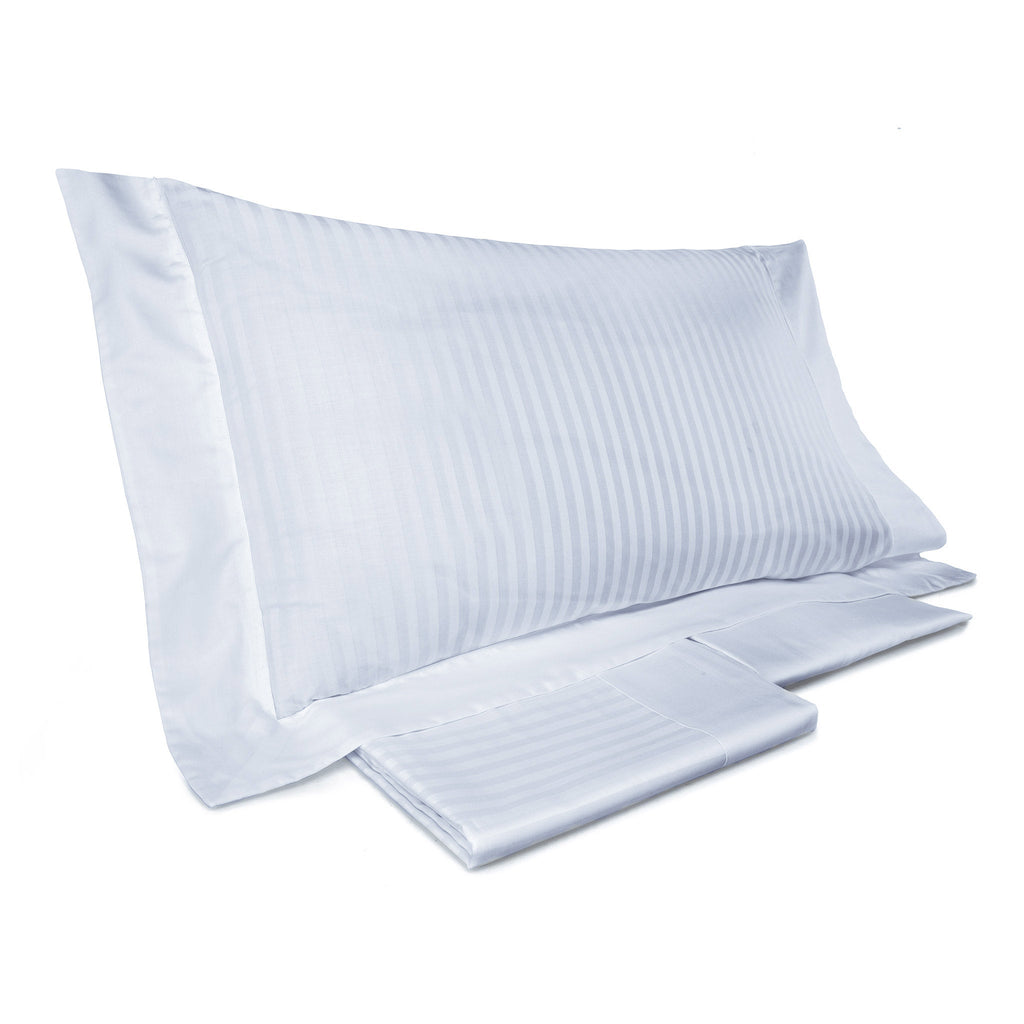 Completo letto in raso di puro cotone rigato, 300 fili. Il set è composto da Lenzuolo Sopra, Sotto con Angoli e 2 Federe dalla tinta elegante che valorizza la brillantezza del finissimo puro cotone rigato.