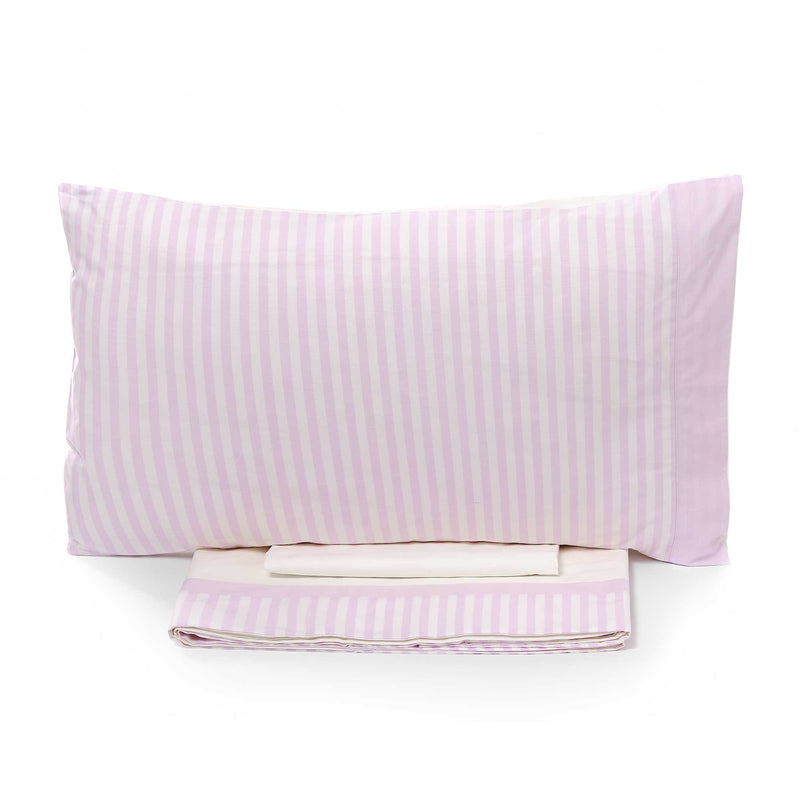 Completo letto in puro cotone tinto in filo, riga media. Include: 1 lenzuolo sopra, 1 lenzuolo sotto con angoli e 2 federe. Interamente realizzato e confezionato in Italia secondo la tradizione tessile artigiana Toscana.