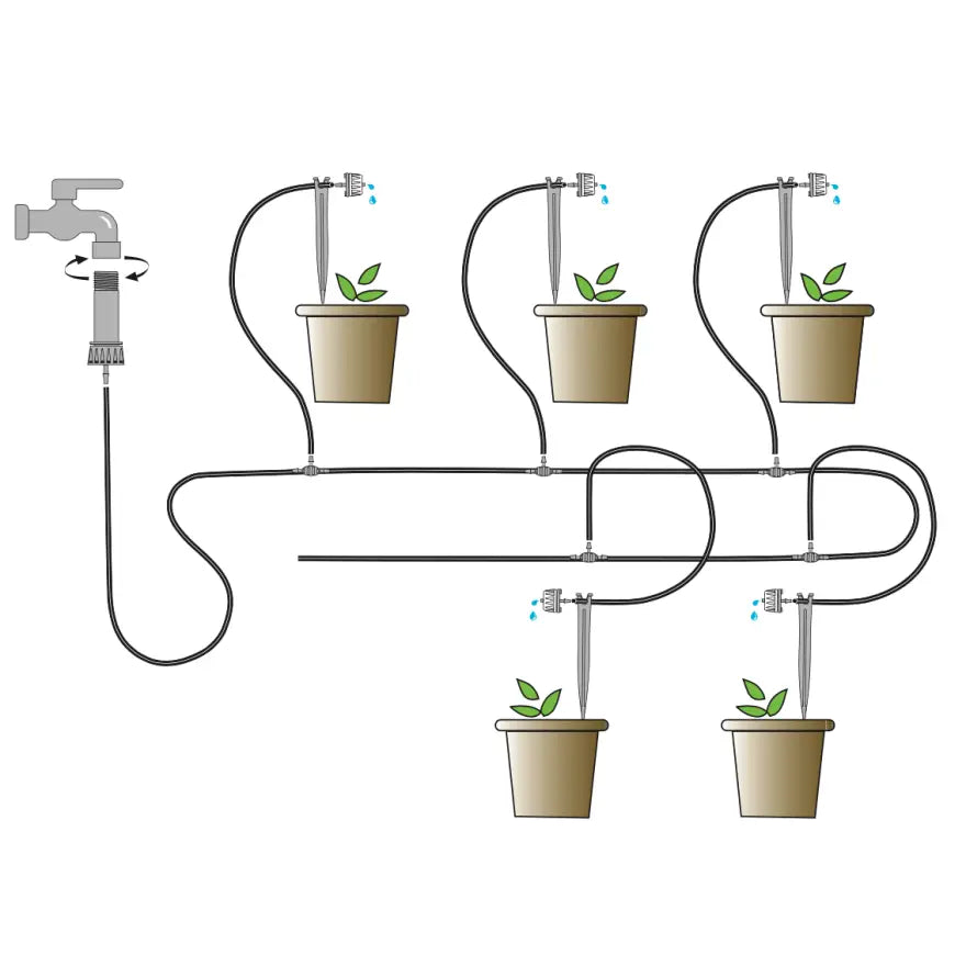 Questo kit completo permette di automatizzare l’irrigazione di più piante in contemporanea, riducendo il tempo speso per innaffiare manualmente. Facile da installare, si inserisce direttamente al rubinetto con un filetto da 3/4” oppure su qualsiasi tipo di centralina per rendere l’impianto automatico.