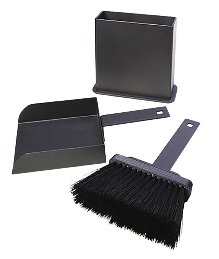 Set di accessori per pellet composto da contenitore, paletta e scopino.