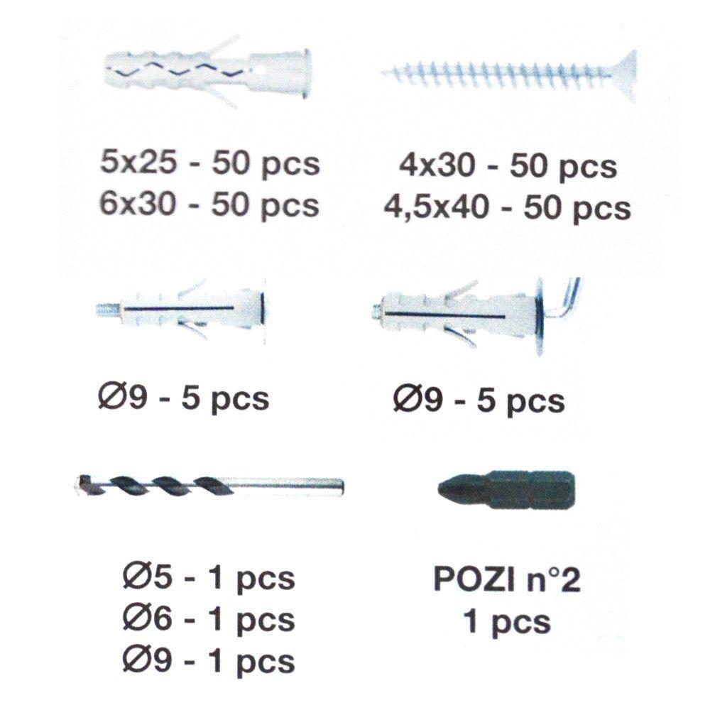 Indicati per: Calcestruzzo, Mattone pieno, Mattone semipieno, Mattone forato, Blocco forato Poroton, Blocco forato cemento, Blocco forato Leca, Cemento cellulare, Pietra compatta - Vite: Ø4x30 (50pcs) e Ø4.5x40 (50pcs)