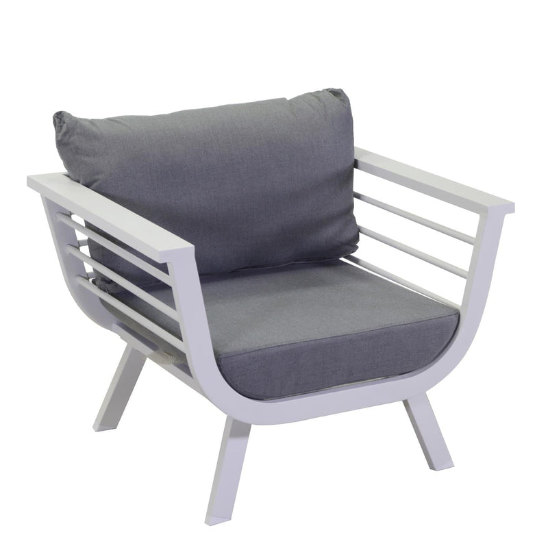 Questo set da esterno è composto da una struttura in alluminio verniciata a polvere bianca, completa di cuscini seduta e schienale in tessuto grigio sfoderabile con spessore di 12 cm. I cuscini sono realizzati al 100% in poliestere impermeabile. Il tavolo ha un piano in alluminio, mentre le sedie sono smontate con solo le gambe da montare. Le dimensioni della poltrona sono di 84x72h61 senza cuscino, con un'altezza di 80 cm compresi i cuscini per lo schienale.