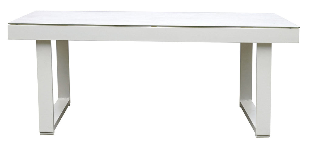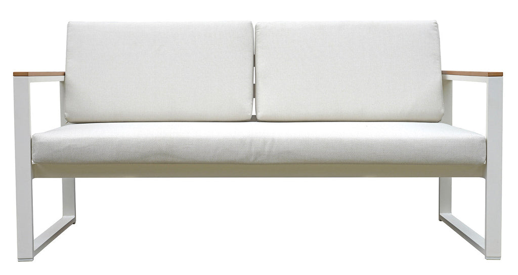 Il set da esterno Cerveteri è composto da due poltrone, un divano e un tavolino con piano in Ceramic Glass effetto cemento. Le dimensioni delle poltrone sono di 75x70x75 cm, mentre il divano misura 162x70x75 cm (LxAxP). La struttura è in alluminio bianco, con braccioli in resina color teak e cuscini sfoderabili in poliestere ecru, ideali per un comfort e stile senza tempo nel giardino o sul terrazzo.