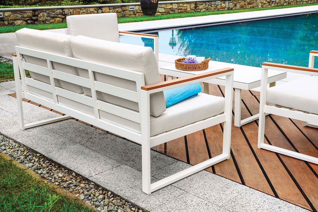 Set Salotto da Giardino Divano 2 Poltrone e Tavolino Cerveteri in Alluminio Bianco e Ecrù