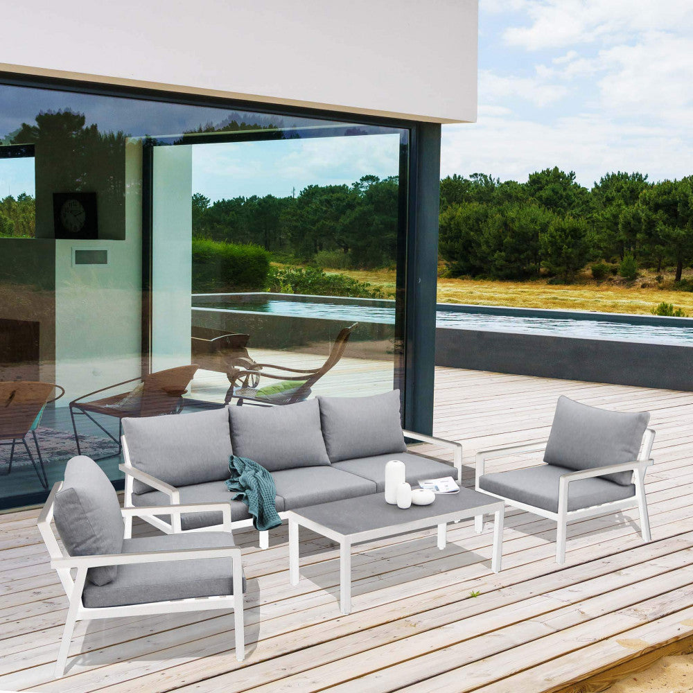 Set Salotto da Giardino Divano 2 Poltrone e Tavolino con Cuscini in Alluminio Bianco