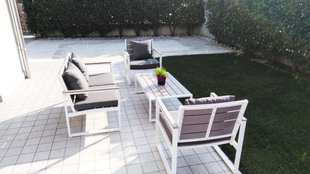 Set Salotto da Giardino Divano 2 Poltrone e Tavolino con Cuscini in Alluminio Bianco