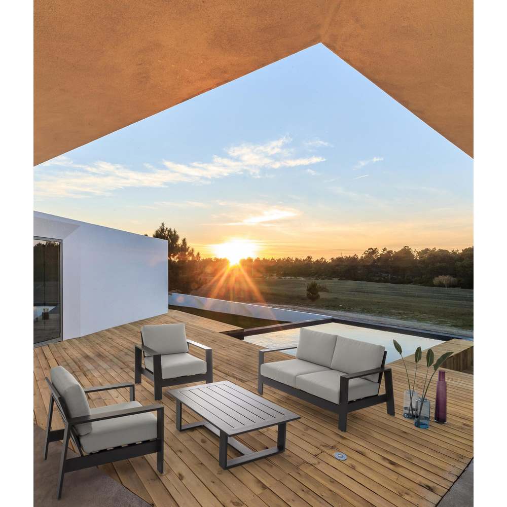 Riscoprire la bellezza del proprio outdoor è necessario per vivere la propria casa al meglio. Grazie a Bars Saloto da giardino in alluminio il relax all'aria aperta sarà ancora più piacevole. Il set divani da giardino alluminio Bars Grigio è composto da un divano biposto che misura 156 x 85.5 x 83cm, due poltrone singole della misura di 86 x 85.5 x 83cm ciascuna e un tavolino da caffè con misure 120 x 68 x 29 cm.L'intera struttura è in alluminio verniciato a polvere epossidica, con uno spessore della lastra di alluminio utilizzata per creare il set Bars grigio di 2mm. Tutte le sedute presentano dei cuscini in tinta, sfoderabili, creati con tessuto olefin (100%polypropylene).