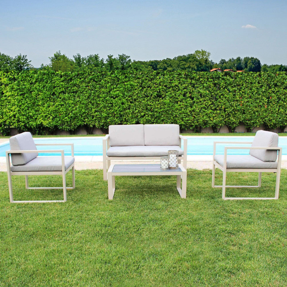 Set Salotto da Giardino Divano 2 Poltrone e Tavolino con Cuscini in Alluminio Tortora
