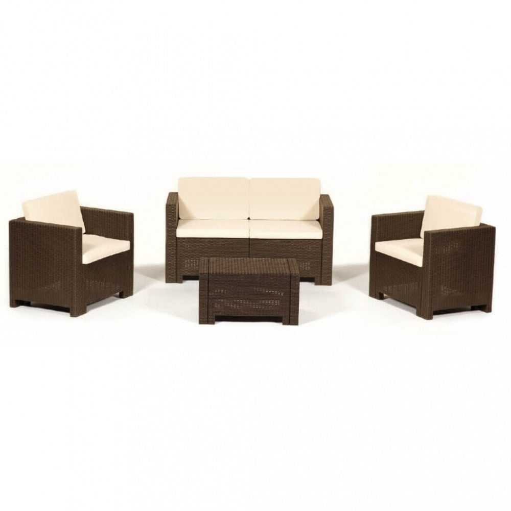 Set Salotto da Giardino Divano 2 Poltrone e Tavolino con Cuscini in Polipropilene Marrone