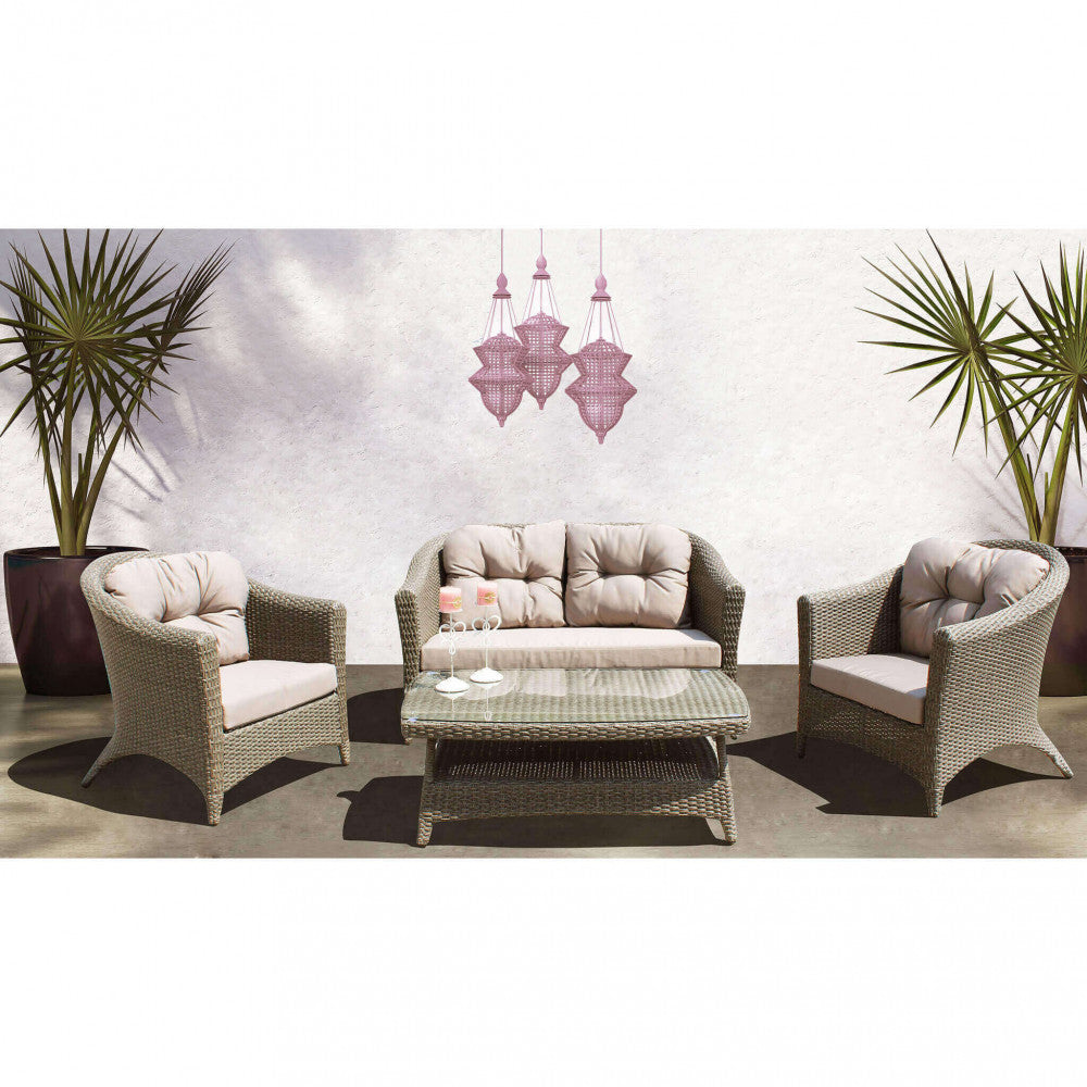 Set Salotto da Giardino Divano 2 Poltrone e Tavolino con Cuscini in Wicker