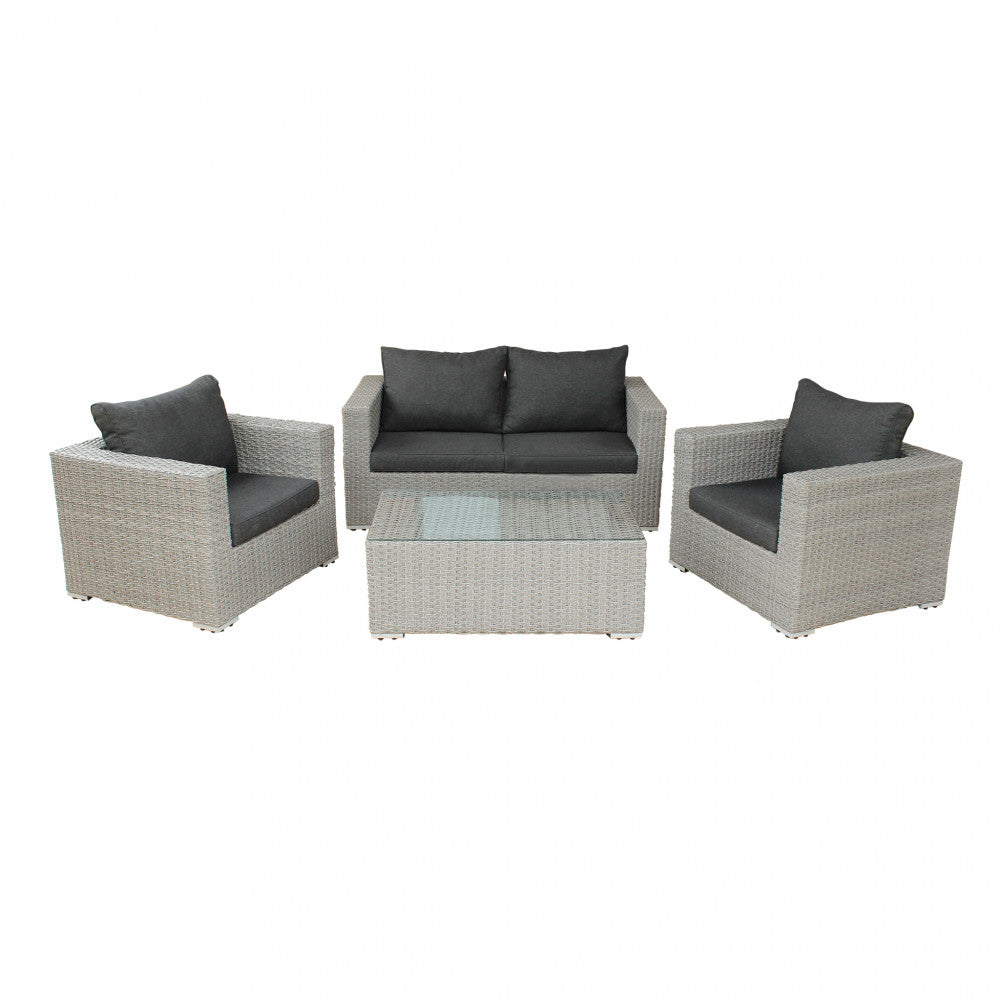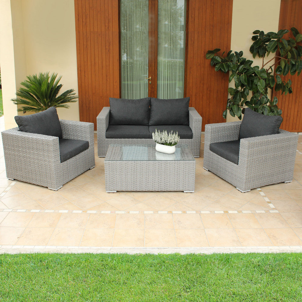 Set Salotto da Giardino Divano 2 Poltrone e Tavolino con Cuscini in Wicker Grigio