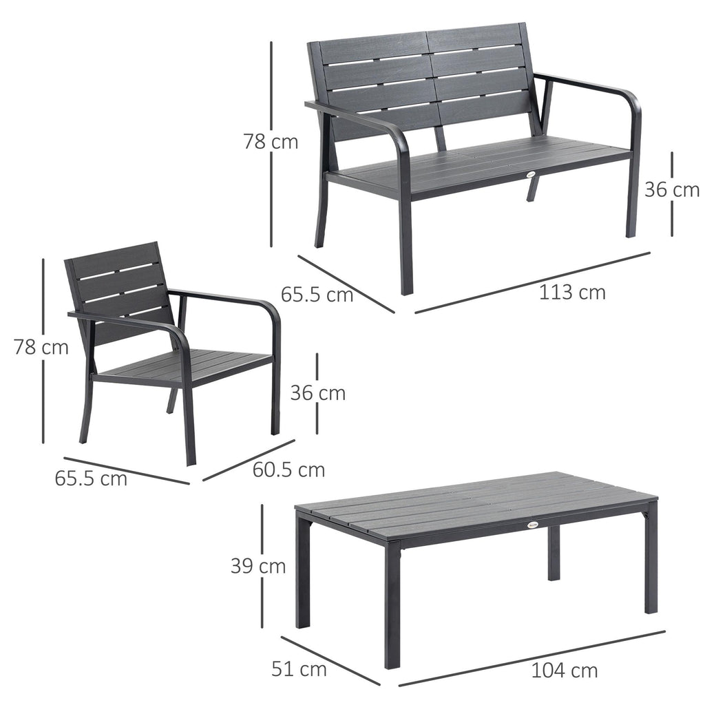 Rallegra il tuo cortile con il nostro salotto da giardino in 4 pezzi : panchina, poltrone e tavolino forniscono un posto per riunire i tuoi amici e la tua famiglia. Realizzato con telaio in acciaio e materiale plastico di alta qualità, questo salotto da giardino può resistere all'aperto per anni. Il piano del tavolino con effetto legno fornisce lo spazio per bevande, snack, libri e accessori. Decorativo e funzionale, crea un angolo accogliente da usare tutto l'anno.