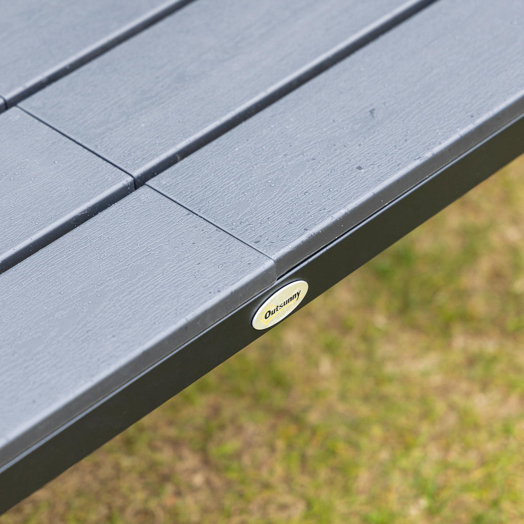 - Il piano del tavolo e le sedute sono in doghe di plastica con venature del legno, eleganti e facili da pulire