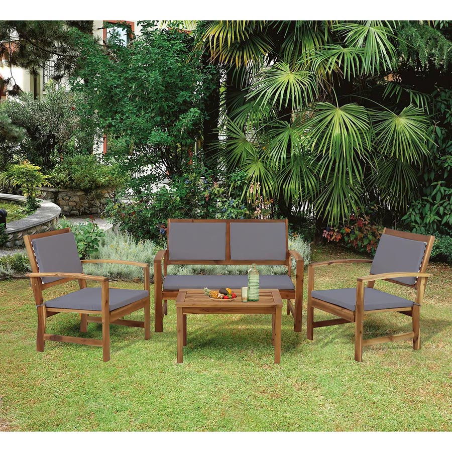 Set Salotto da Giardino Divano 2 Poltrone e Tavolino in legno Naturale con Cuscini Grigi Sassari