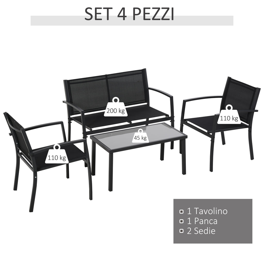Set Salotto da Giardino Divano 2 Poltrone e Tavolino in Metallo e Tessuto Nero
