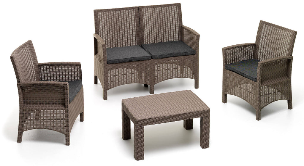 Set Salotto da Giardino Divano 2 Poltrone e Tavolino in Polipropilene Effetto Rattan London Tortora
