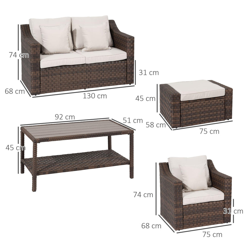 - DIMENSIONI: Dimensioni divanetto per esterni: 130L x 68P x 74Acm. Dimensioni poltrona: 75L x 68P x 74Acm. Dimensioni del poggiapiedi: 75L x 58P x 39Acm Dimensioni tavolino: 92L x 51P x 45Acm. Capacità di peso: 160kg (divano), 160kg (poggiapiedi), 50kg (tavolino)
