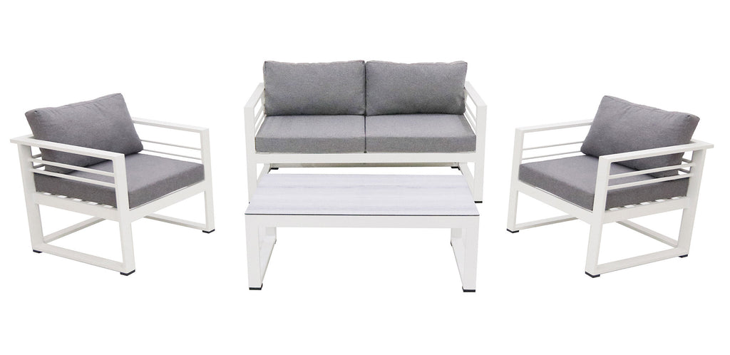Leros è un salotto in alluminio per spazi aperti con cuscineria sfoderabile.