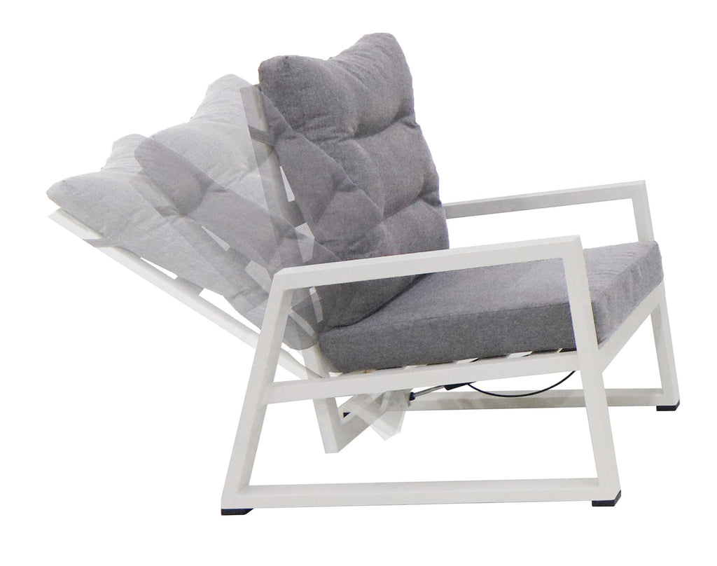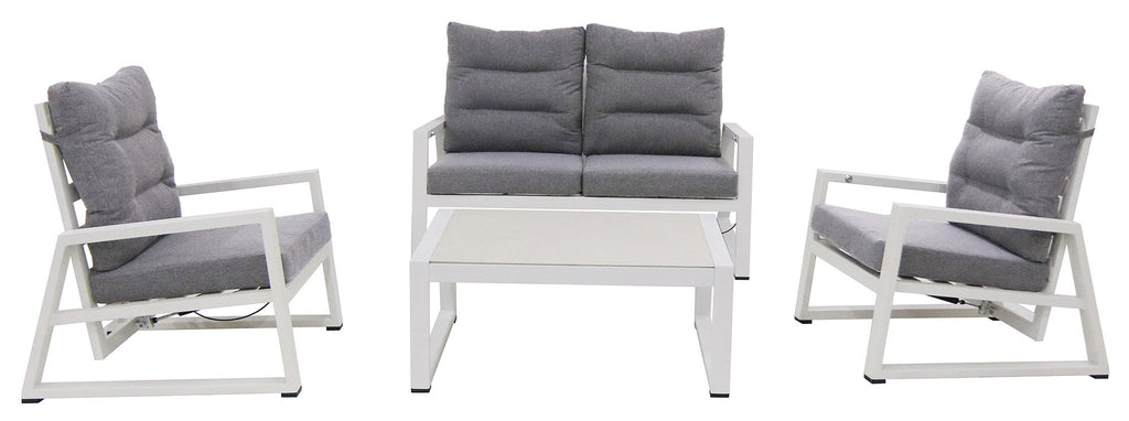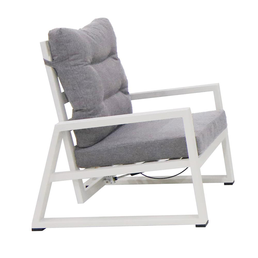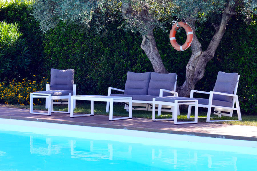 Mikonos è un salotto per spazi aperti in alluminio con schienali reclinabili e con cuscineria sfoderabile.