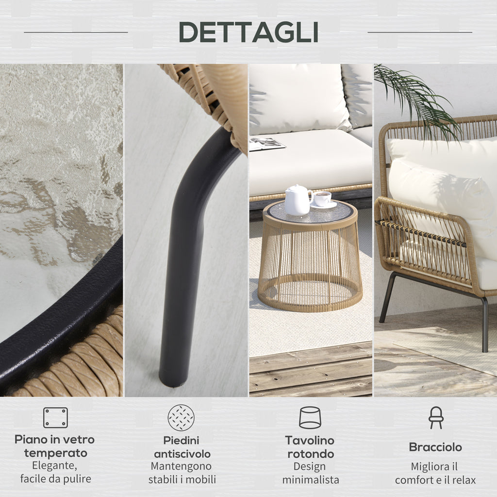 Vuoi rinnovare il tuo arredamento da giardino? Questo set da 3 pezzi porterà eleganza e comodità nei tuoi ambienti! Il set è composto da un tavolino, un divano 2 posti e una chaise longue che si combinano come divano angolare. La solida struttura in acciaio e il rattan sintetico garantiscono la solidità e la resistenza della struttura di questi mobili da giardino. I morbidi cuscini ti offrono un comfort ottimale per rilassarti all'aria aperta mentre il tavolino con ripiano in vetro temperato aggiunge un tocco di eleganza.