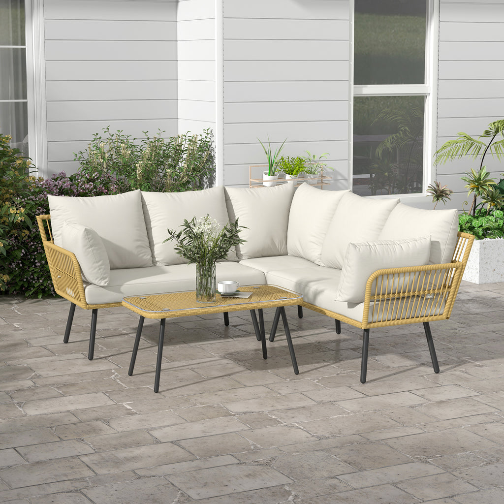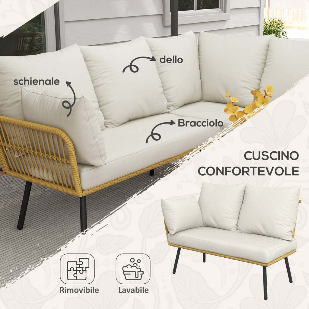 Set Salotto da Giardino Divano Angolare e Tavolino in Rattan e Poliestere Bianco Crema