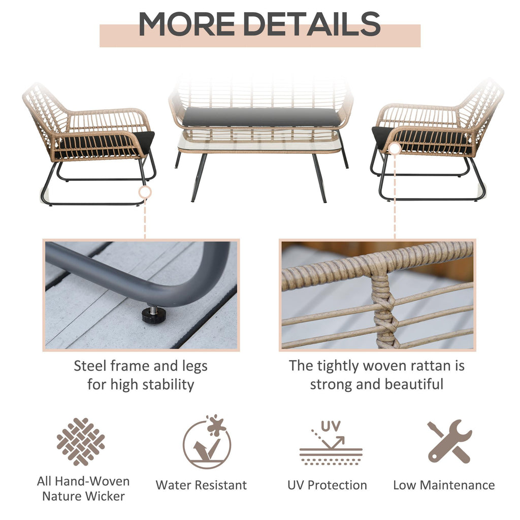 Set Salotto da Giardino Divano 2 Poltrone e Tavolino in Rattan Naturale e Poliestere Nero