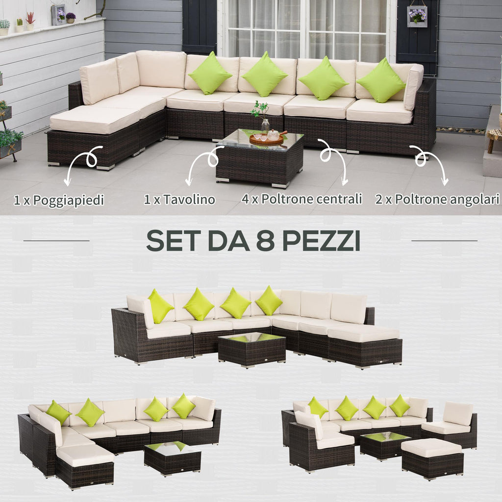 - SET SALOTTO DA GIARDINO 8 PEZZI: Include due posti angolari, quattro posti centrali, un poggiapiedi e un tavolino quadrato. Si adatta facilmente a qualsiasi spazio esterno.