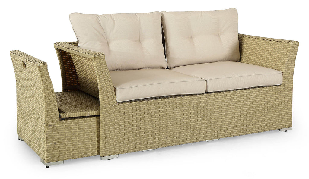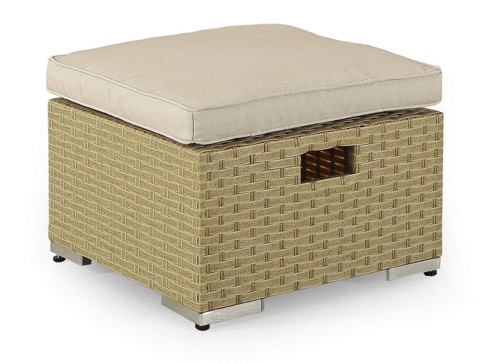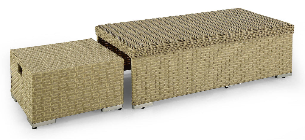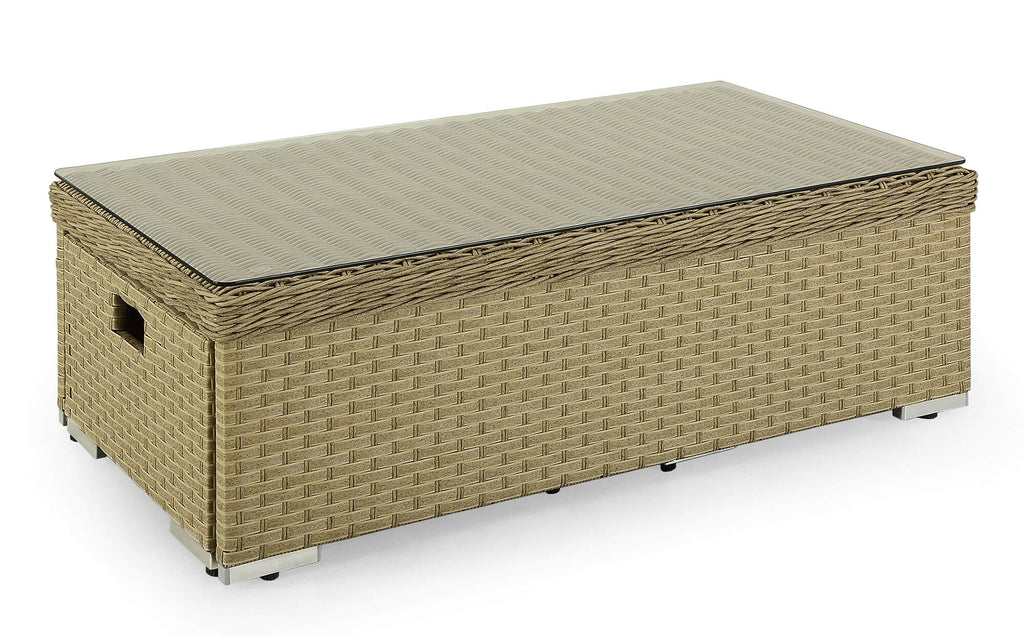 Elegante e ricercato lo stile di questo salotto da esterno in grado di valorizzare qualsiasi ambiente in cui verrà collocato, dal giardino al terrazzo , dal bordo piscina a spazi coperti da pergolati o tende parasole. Il set composto da tavolo, divano, 2 poltrone e 2 poggiapiedi che possono essere utilizzati anche da seduta, risulta particolarmente confortevole anche grazie ai morbidi e grandi cuscini. Il tavolo da caffè con piano in vetro temperato garantisce sicurezza e massima resistenza oltre ad un design contemporaneo e raffinato. La possibilità di riporre le poltrone all'interno del divano ed i poggiapiedi sotto il tavolo rende questo articolo estremamente funzionale anche in un ottica di ottimizzazione degli spazi esistenti. La struttura completamente in alluminio e il materiale di rivestimento in Rattan sintetico garantiscono una qualità duratura nel tempo resistente agli agenti atmosferici e ai raggi UV.
