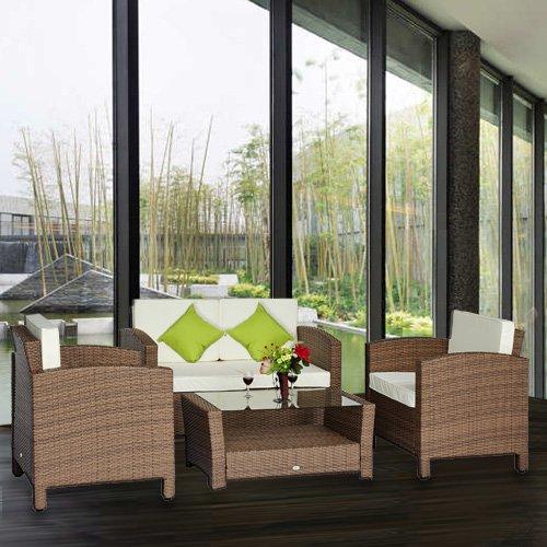 Set Salotto da Giardino in Rattan Sintetico Tavolino Divano e 2 Poltrone con Cuscini Marrone Chiaro