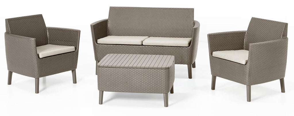 Set Salotto da Giardino in Resina Divano 2 Poltrone e Tavolino Bauer Salemo Cappuccino