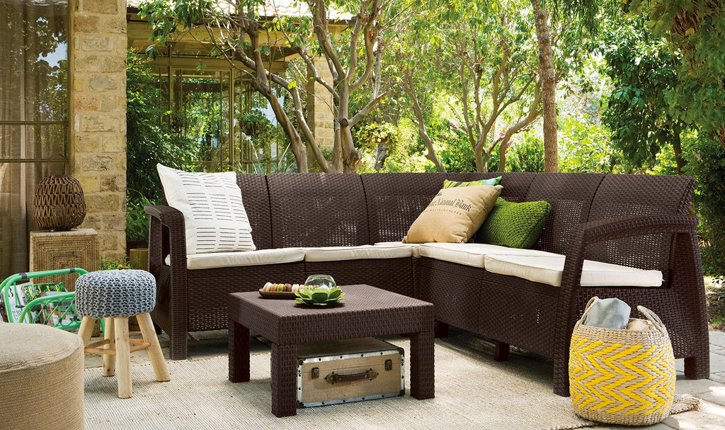 Set Salotto da Giardino in Resina Divano 6 Posti e Tavolino Marrone