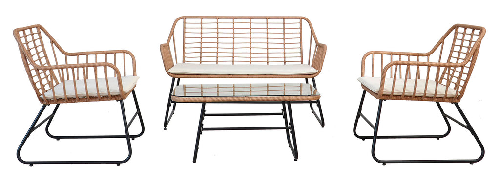 - Struttura in acciaio verniciato nero, seduta in polyrattan color naturale completa di cuscini di color bianco