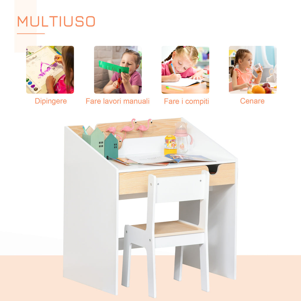 Set Scrivania e Sedia per Bambini con Cassetto e Scaffale in MDF Bianco e Legno