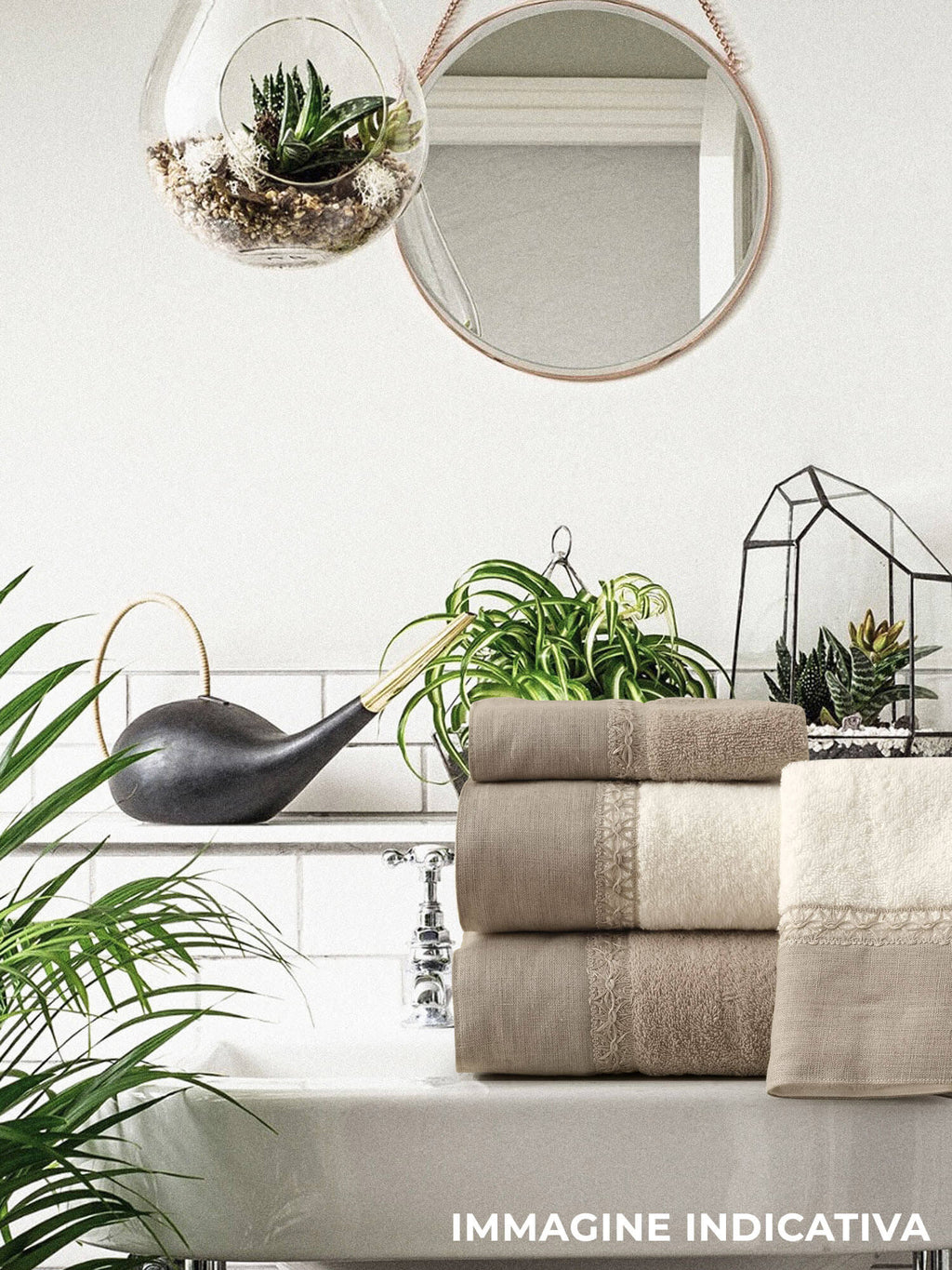 2 asciugamani viso + 2 asciugamani ospite in spugna di puro cotone 430 gr/mq con balza e trina di lino. Tutti gli articoli presenti nel set sono realizzati e confezionati in Italia secondo la tradizione tessile artigiana Toscana.