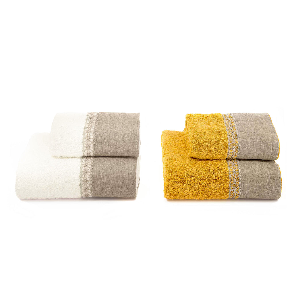 2 asciugamani viso + 2 asciugamani ospite in spugna di puro cotone 430 gr/mq con balza e trina di lino. Tutti gli articoli presenti nel set sono realizzati e confezionati in Italia secondo la tradizione tessile artigiana Toscana.