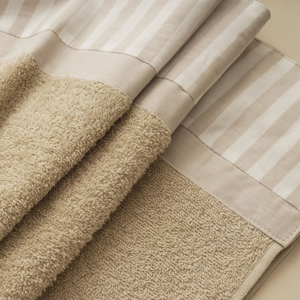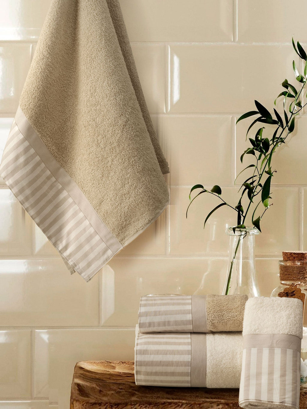 2 asciugamani viso + 2 asciugamani ospite in spugna di puro cotone 430 gr impreziositi da una balza puro cotone tinto in filo, riga media. Tutti gli articoli presenti nel set sono realizzati e confezionati in Italia secondo la tradizione tessile artigiana Toscana.
