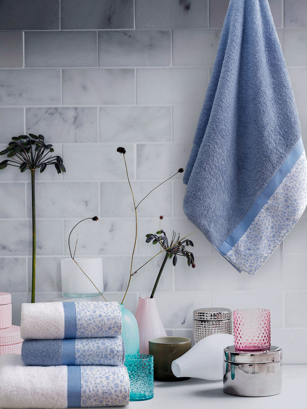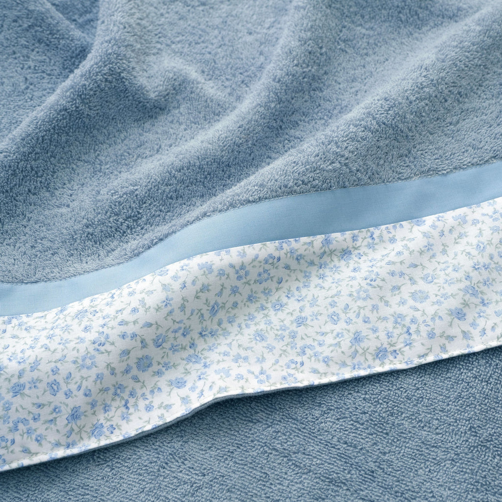 2 asciugamani viso + 2 asciugamani ospite in spugna di puro cotone 430 gr impreziositi da una balza in percalle stampato. Tutti gli articoli presenti nel set sono realizzati e confezionati in Italia secondo la tradizione tessile artigiana Toscana.