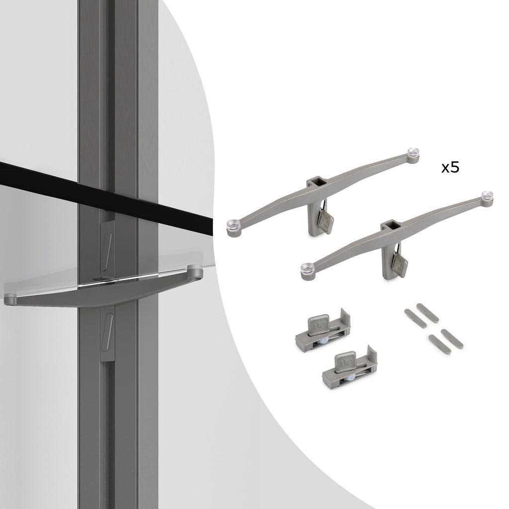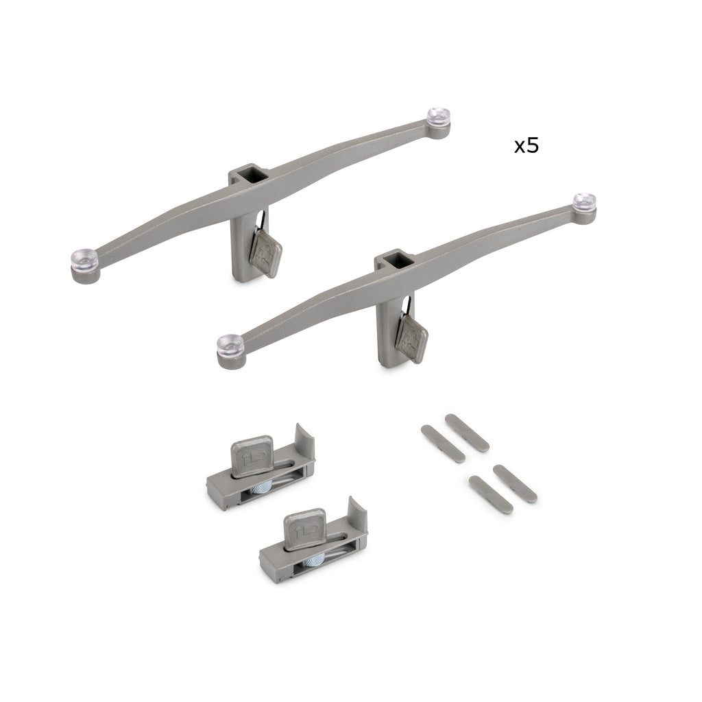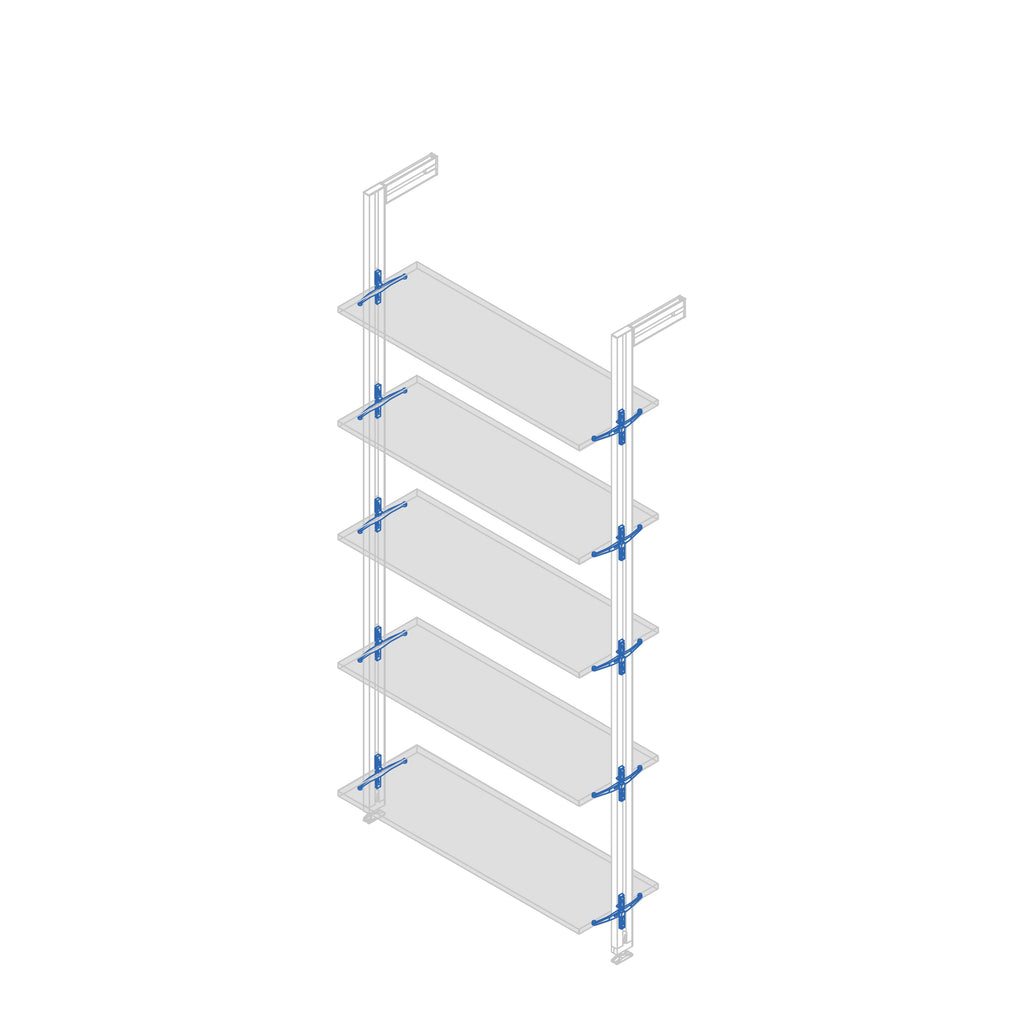 Lotto di 5 set di supporti in zamak per uno scaffale in vetro. Il montaggio viene eseguito sul profilo, componendo così la struttura modulare Zero da voi preferita.