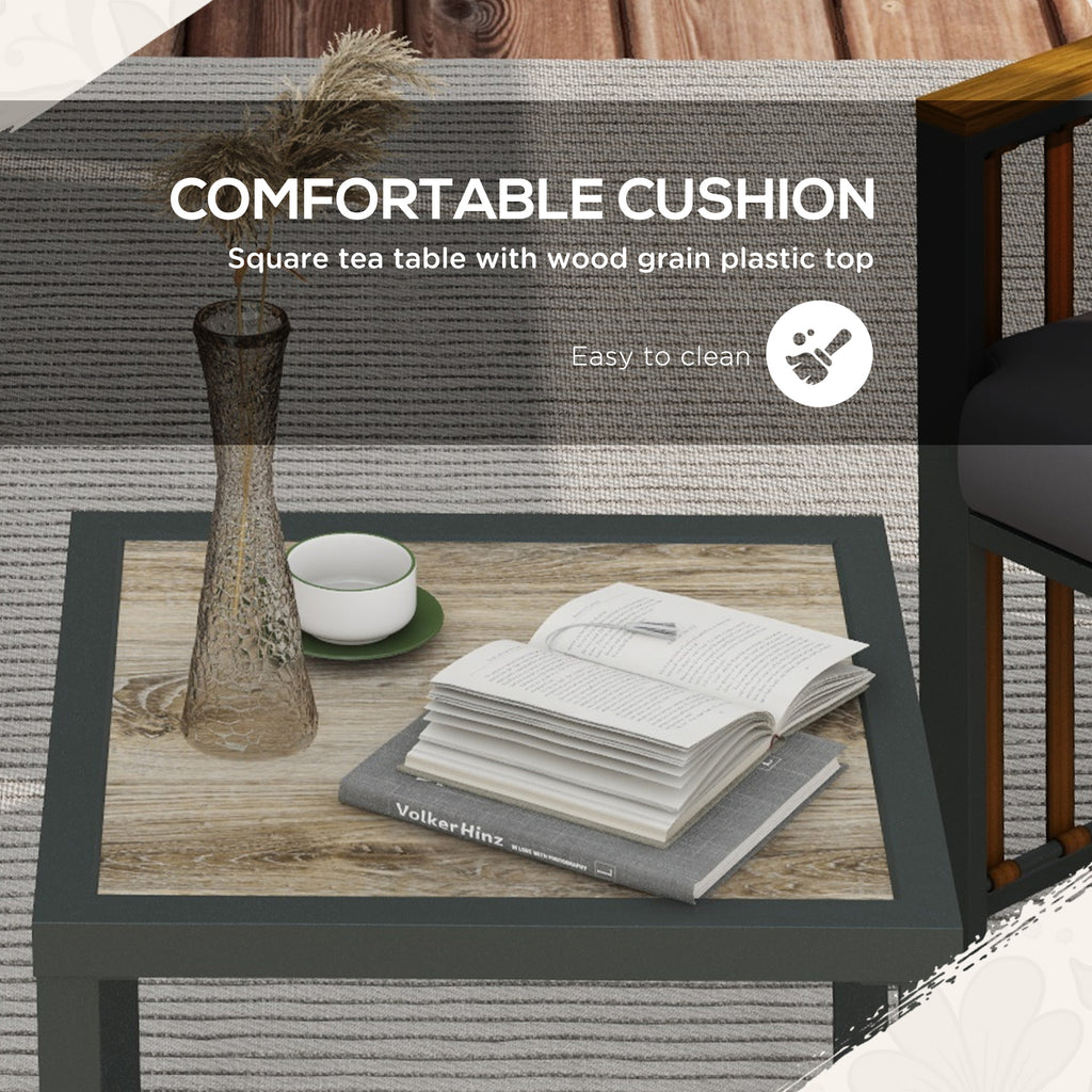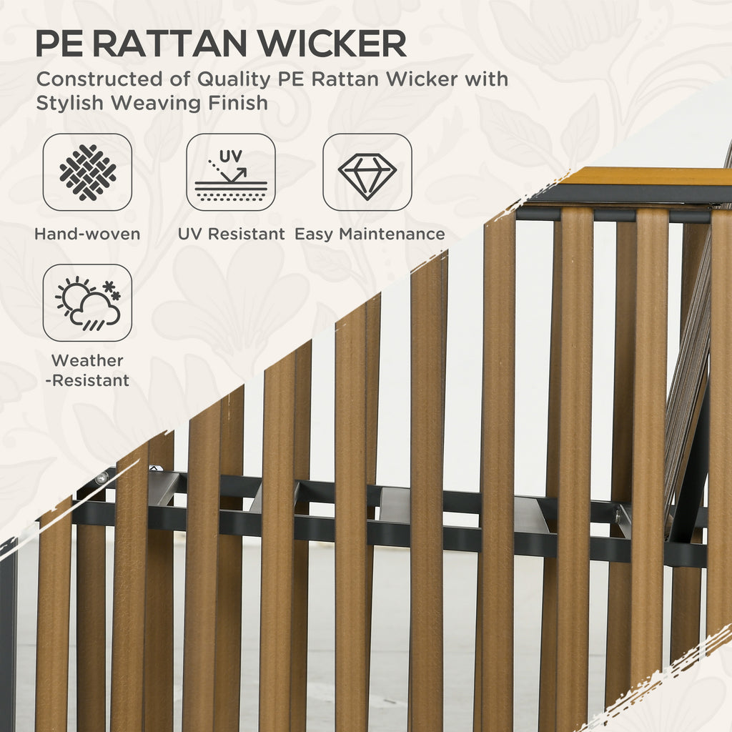 Questo set da giardino da 3 pezzi d'arredo rattan può essere inserito in qualsiasi spazio aperto a tua scelta. Costituito da una struttura in metallo e avvolto in rattan PE di alta qualità, la sua realizzazione garantisce una lunga durata di utilizzo. I cuscini imbottiti di 10 cm di spessore offrono un comfort extra, mentre il rivestimento in pannelli di plastica con venature di legno sui braccioli delle sedie e sul tavolino da caffè garantisce comfort e un look elegante.