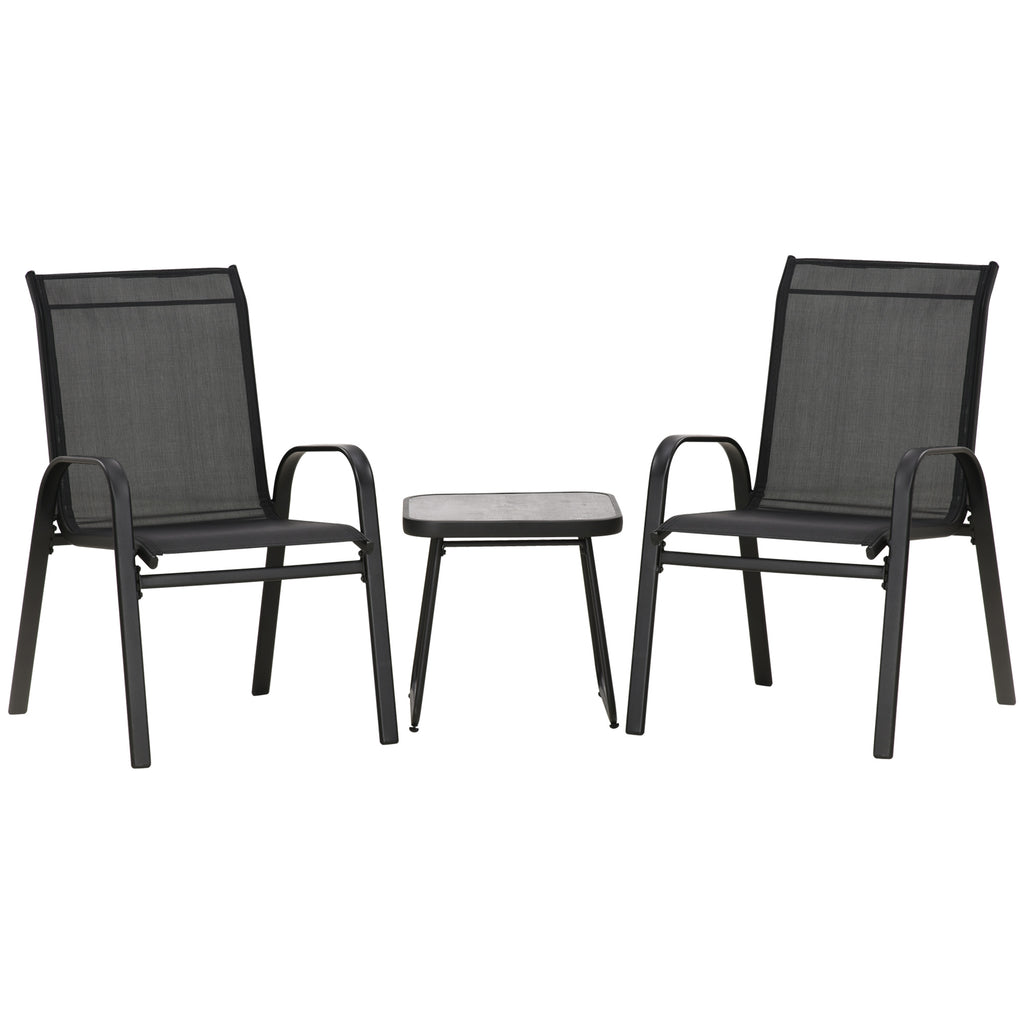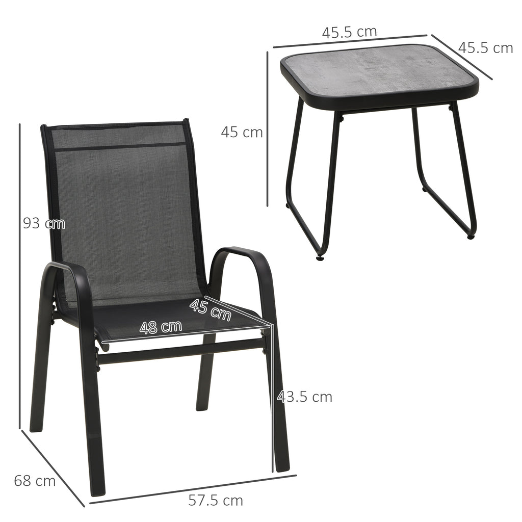 Set Tavolino e 2 Sedie Impilabili da Giardino in Acciaio e Tessuto Traforato Nero
