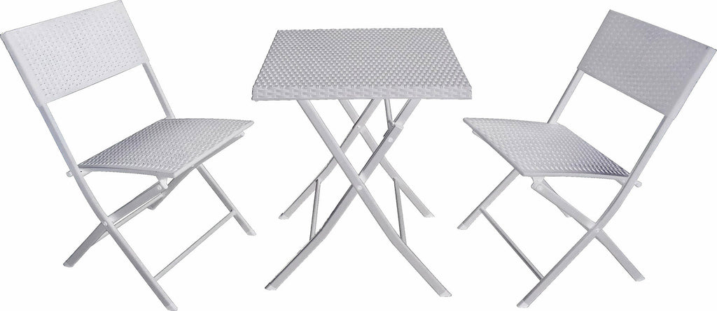 Set Tavolino e 2 Sedie pieghevoli in Acciaio con piano tavolo, seduta e schienale in synt-rattan PP. Adatto ad uso interno ed esterno (giardino, balcone, patio, ecc). Il design pieghevole consente di spostarlo da un posto all'altro facilmente e di riporlo comodamente quando non viene utilizzato.