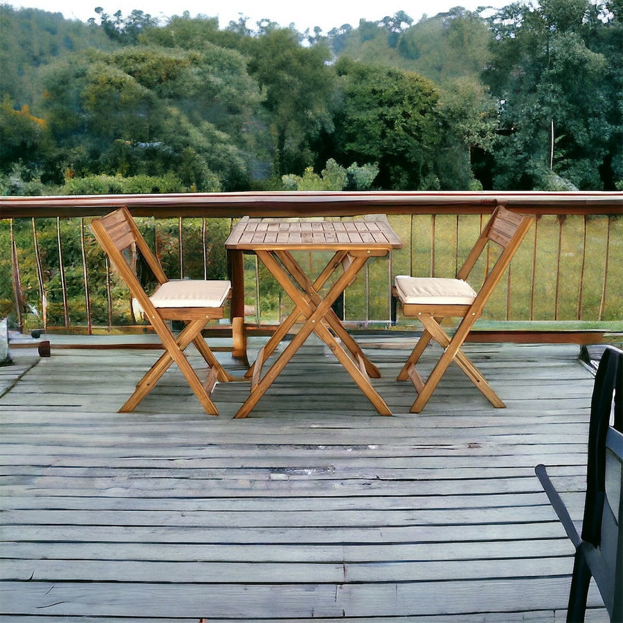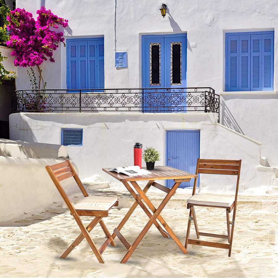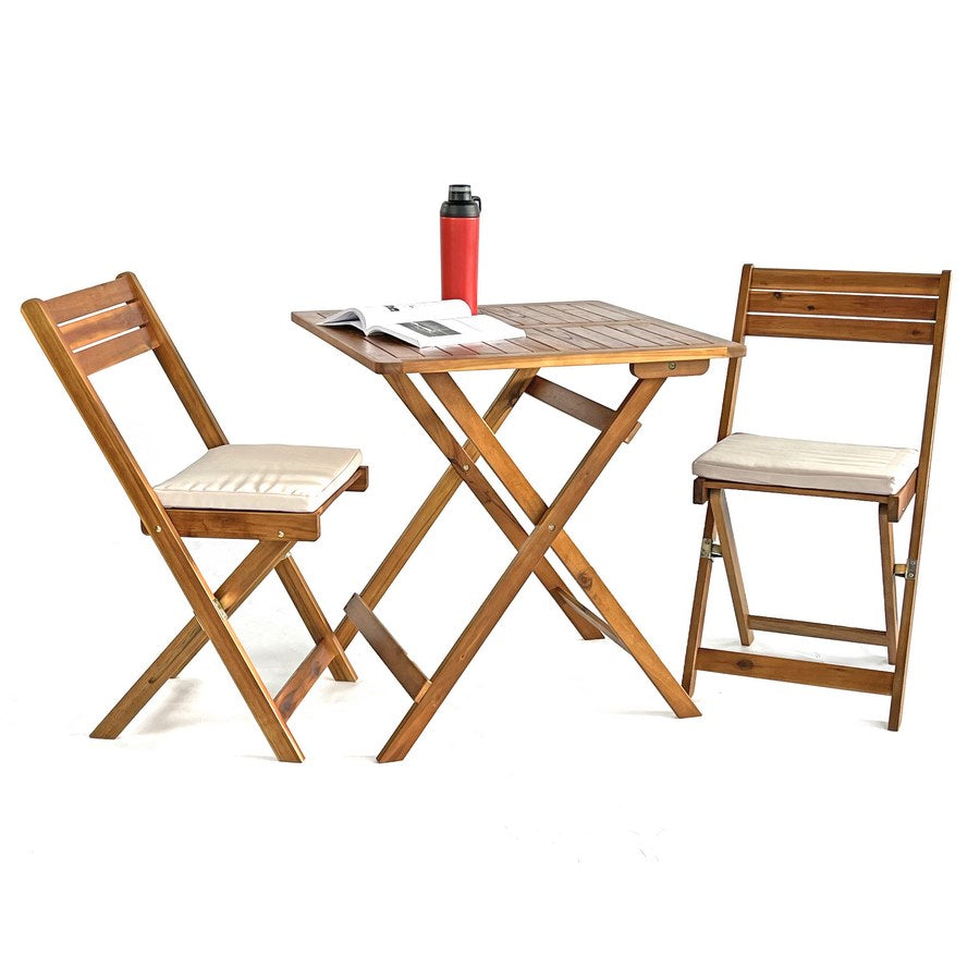 Set Tavolino e 2 Sedie Pieghevoli da Giardino in Legno con Cuscini Genova
