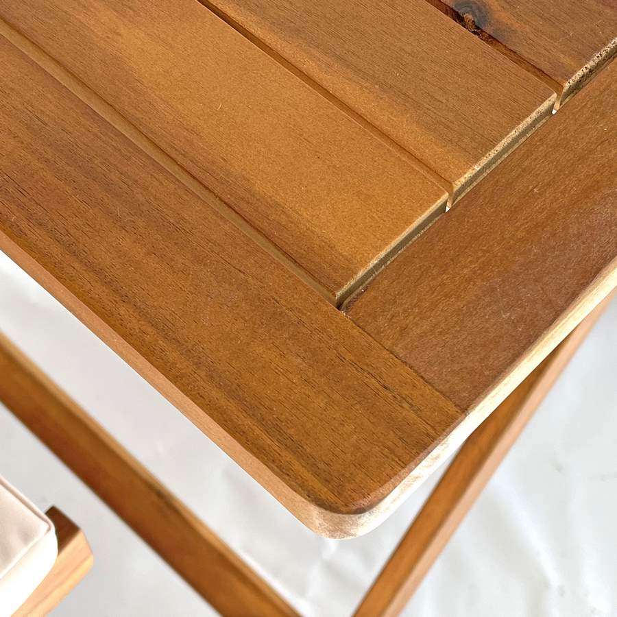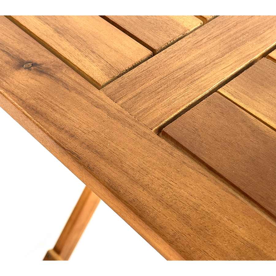 Il set Genova è composto da due sedie pieghevoli in legno con doghe su schienale e seduta, abbinate ad un tavolino, anch'esso facile da ripiegare, sempre con l'intera struttura in legno e con doghe che rendono tutto molto resistente e coerente. Le due sedie da giardino in legno sono dotate di cuscini da esterno per la loro seduta compresi nel prezzo.