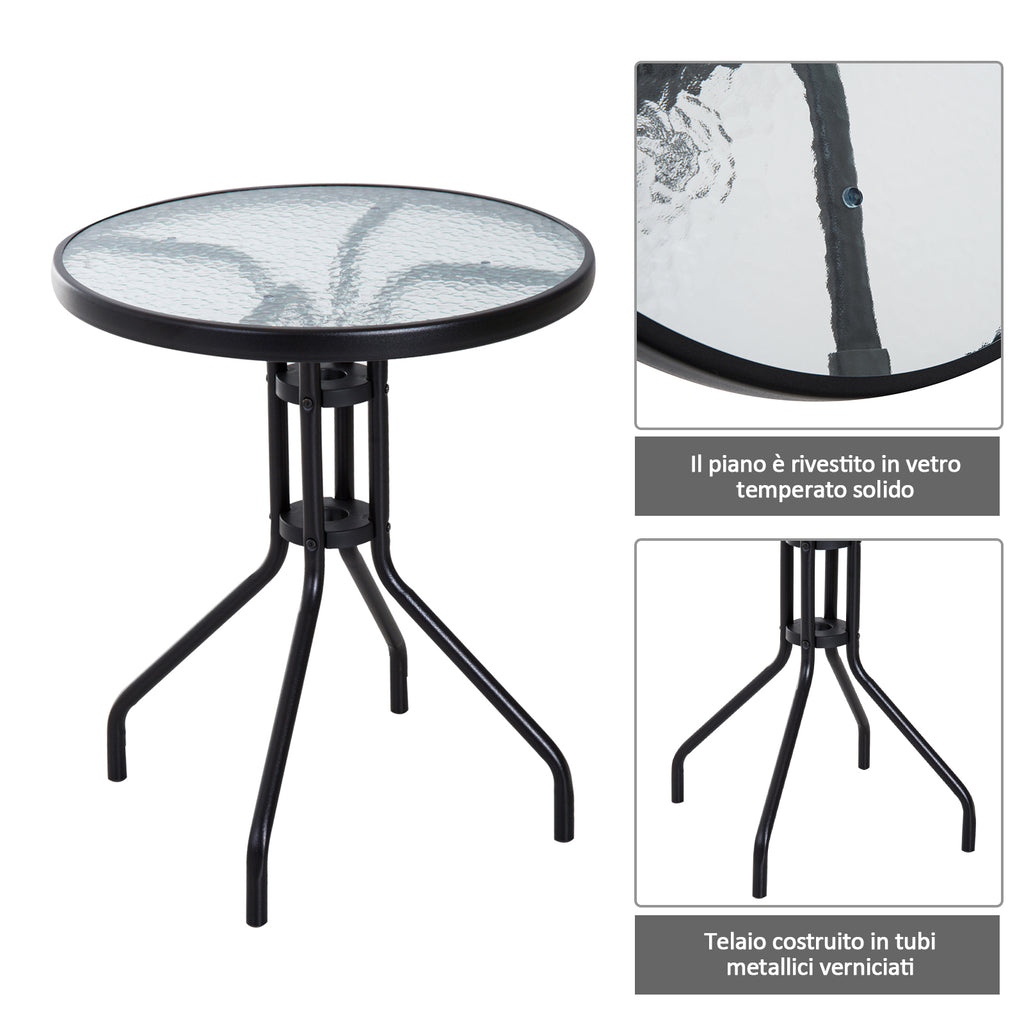 Questo set mobili è composto da un tavolino con piano rivestito in vetro temperato e 2 sedie pieghevoli.