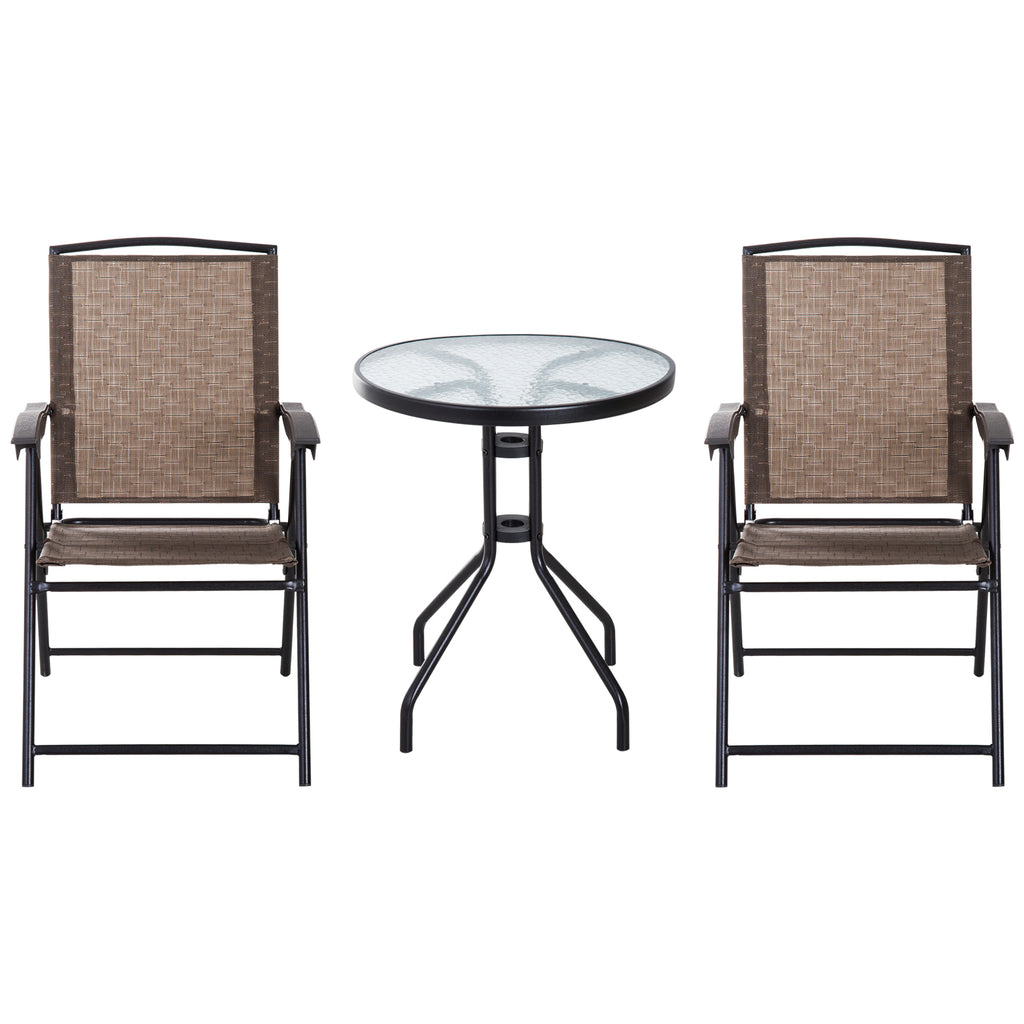Set Tavolino e 2 Sedie Pieghevoli da Giardino in Vetro Marrone