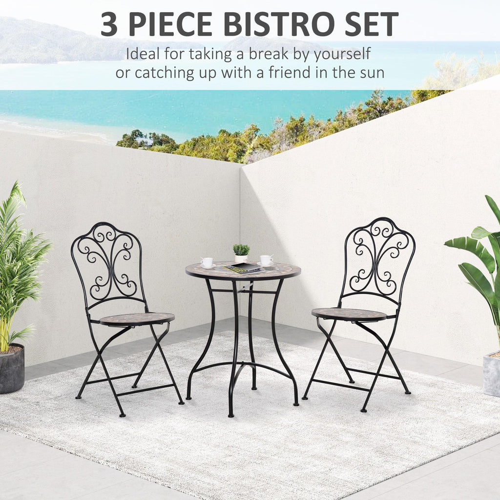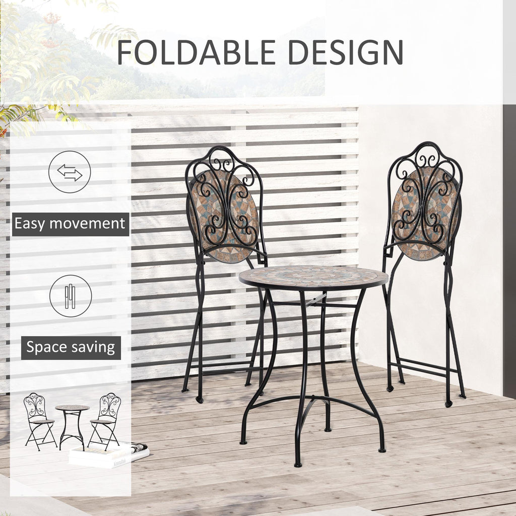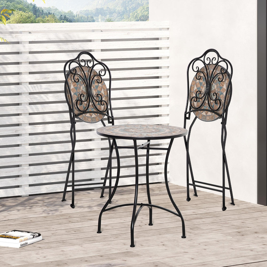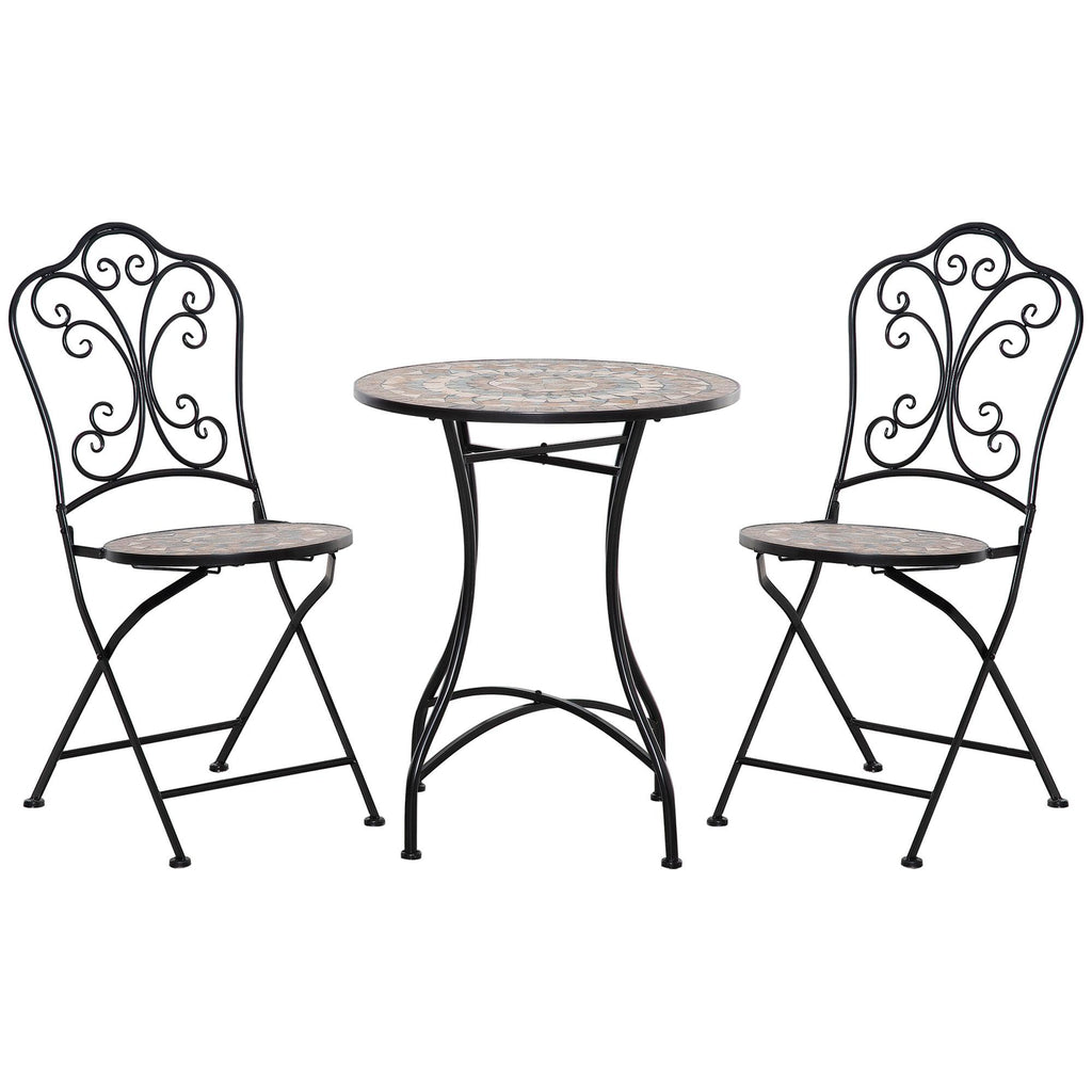 Questo set mobile da giardino composto da 3 pezzi di è la tua soluzione ideale per passare il tempo libero all'aperto. Il design unico delle piastrelle di ceramica dona un tocco romantico al tuo patio, giardino, balcone o ovunque tu ne abbia bisogno. La robusta struttura in metallo con motivi eleganti si adatta bene al piano del tavolo e alle sedute rivestite in piastrelle di ceramica. Inoltre, le sedie sono pieghevoli e poco ingombranti da riporre.