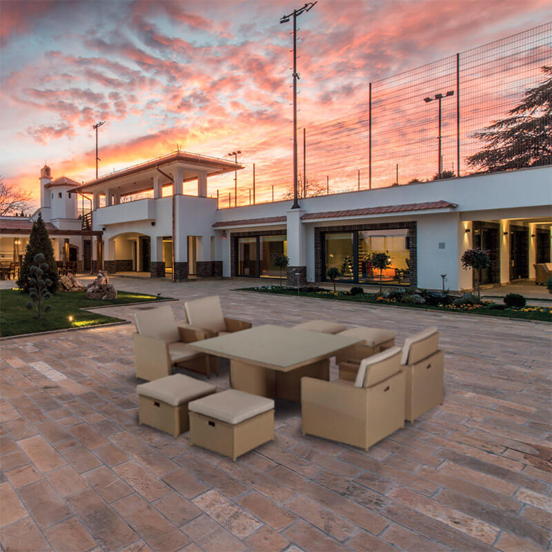 Il set Caravaggio racchiude in sé molteplici qualità. Grazie alle poltrone con ampio bracciolo, comodi cuscini e schienale ribaltabile, la seduta risulta particolarmente confortevole. Gli utili poggiapiedi grazie alla loro generosa dimensione e alla dotazione di cuscino, possono essere in realtà utilizzati come seduta vera e propria trasformando il nostro set da 4 ad 8 posti. L'altezza del tavolo ed il suo ripiano in vetro temperato che assicura la massima affidabilità e resistenza, rendono questo set particolarmente indicato a zone bar e ristoro dove sarà possibile degustare ottimi buffet e aperitivi in completo relax. Lo schienale della poltrona può essere racchiuso e i poggiapiedi semplicemente riposti sotto di essa e il tutto riposto sotto al tavolo, garantendo quindi la massima funzionalità con il minimo ingombro. Il design raffinato ma contemporaneo rende questo prodotto armonico sia in ambienti in stile moderno che classico. Il Rattan sintetico ha un particolare trattamento di patinatura che lo rende molto morbido e confortevole.