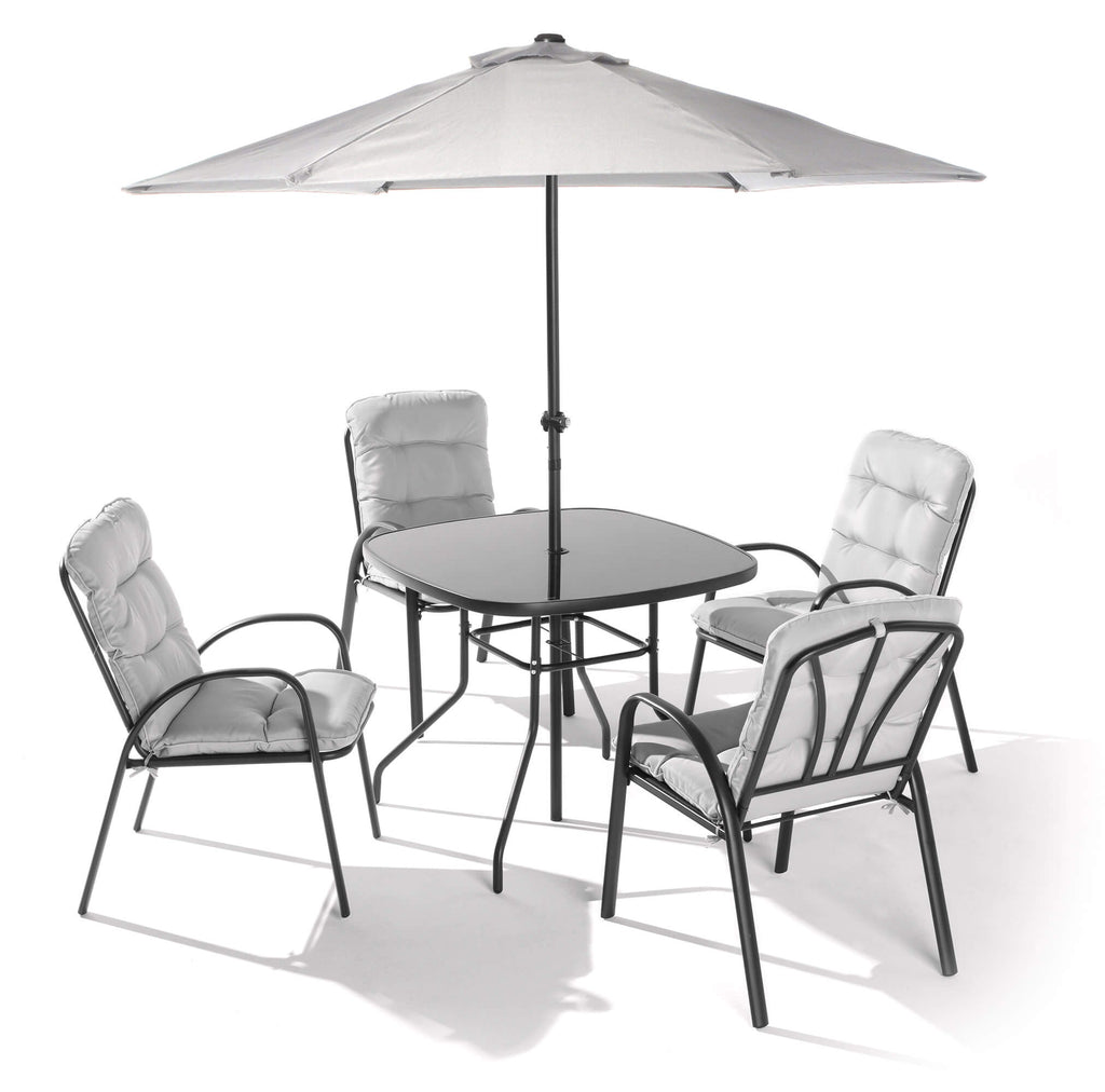 Set Tavolo 4 Sedie e Ombrellone da Giardino in Acciaio con Cuscini Grigio Chiaro