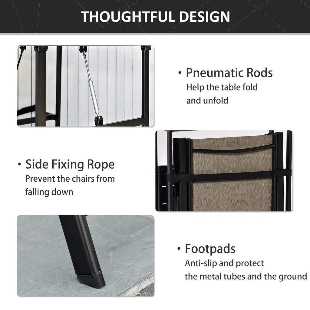 Set Tavolo con Mensola e 2 Sedie Pieghevoli da Giardino in Metallo e Textilene Marrone e Nero